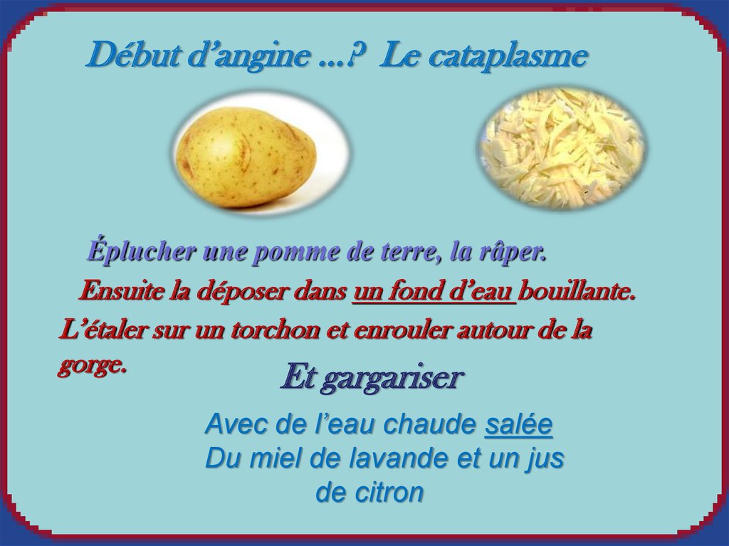 Début d’angine …? Le cataplasmeÉplucher une pomme de terre, la râper.