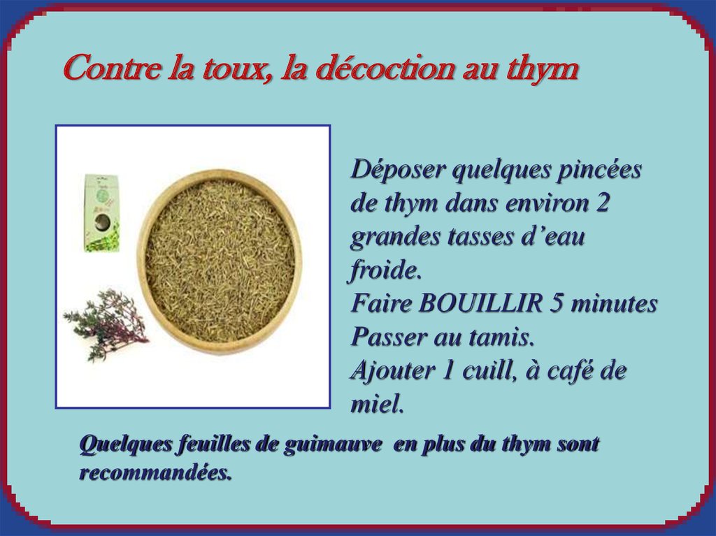 Contre la toux, la décoction au thymDéposer quelques pincées