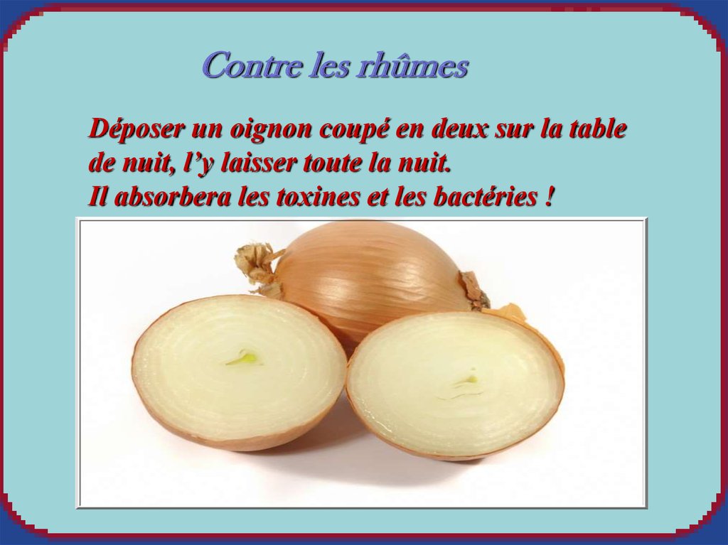Contre les rhûmesDéposer un oignon coupé en deux sur la table