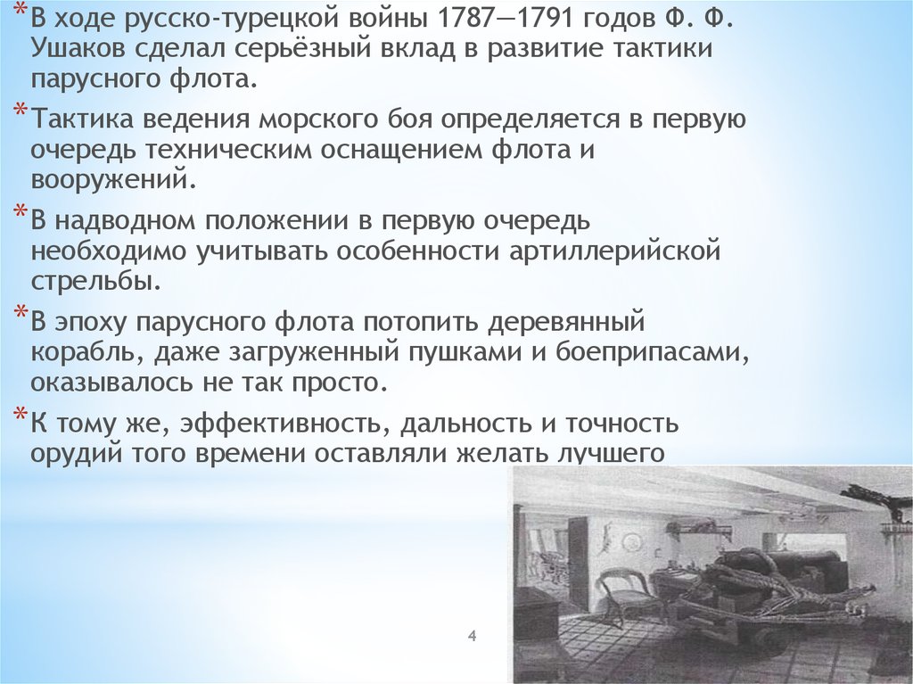 * В ходе русско-турецкой войны 1787—1791 годов Ф. Ф.Ушаков сделал серьёзный вклад в развитие тактики