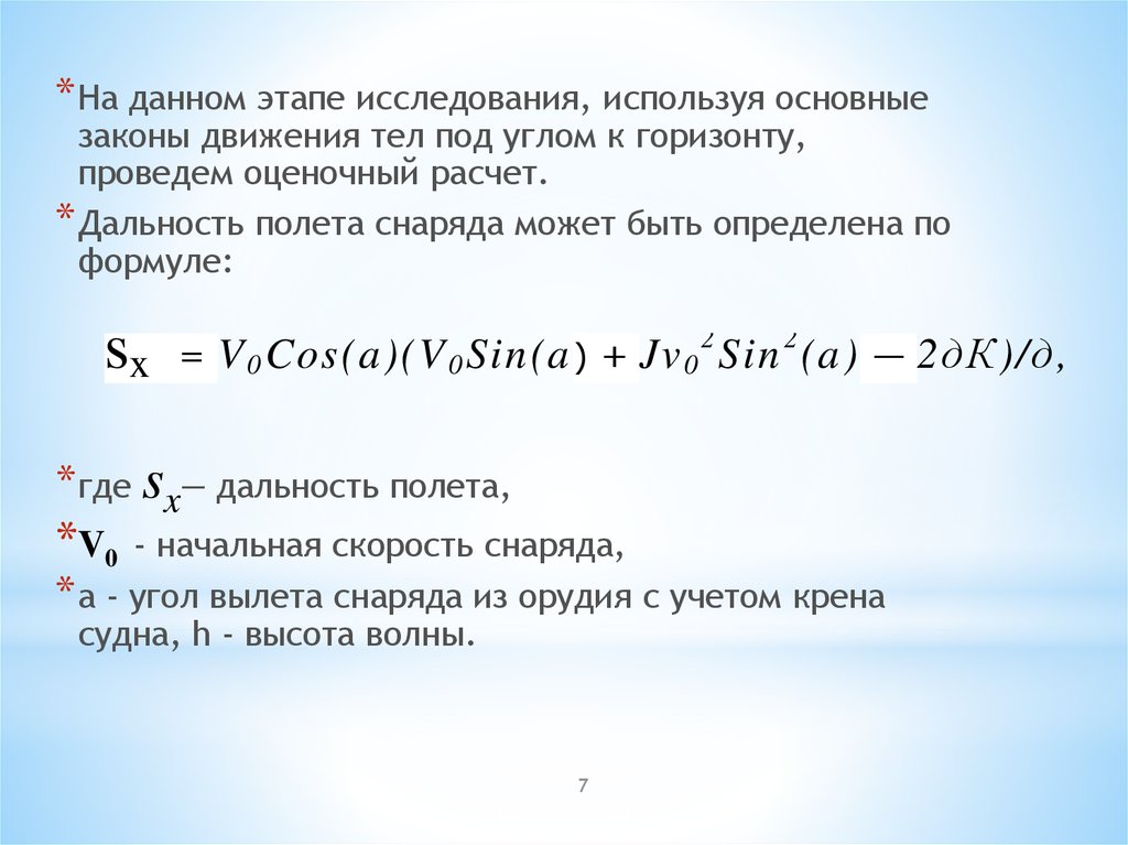 * На данном этапе исследования, используя основныезаконы движения тел под углом к горизонту,