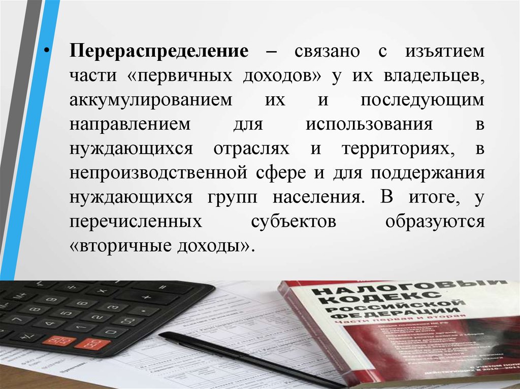 • Перераспределение – связано с изъятиемчасти «первичных доходов» у их владельцев,