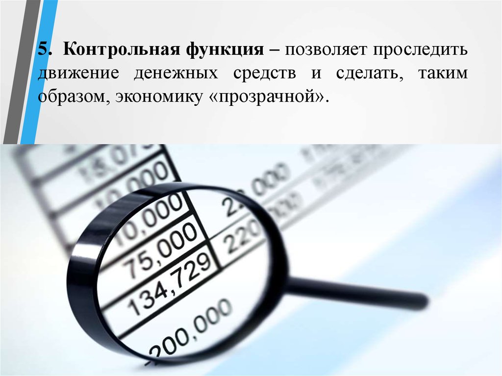 5. Контрольная функция – позволяет проследитьдвижение денежных средств и сделать, таким