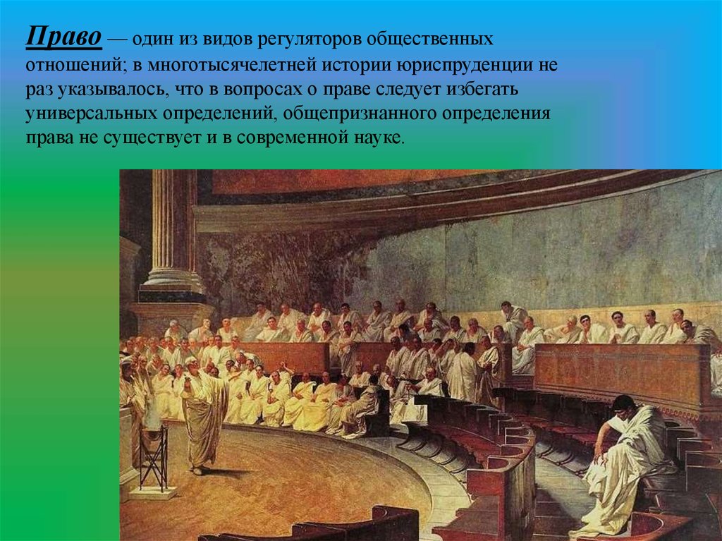 Право — один из видов регуляторов общественныхотношений; в многотысячелетней истории юриспруденции не