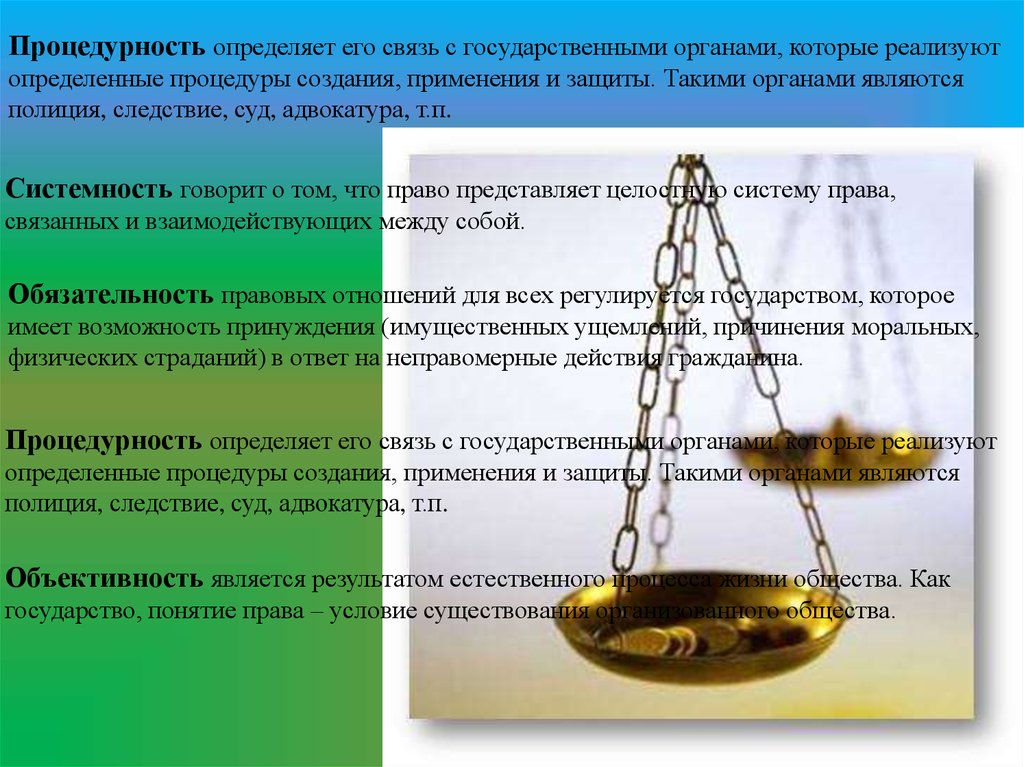 Процедурность определяет его связь с государственными органами, которые реализуютопределенные процедуры создания, применения и защиты. Такими органами являются