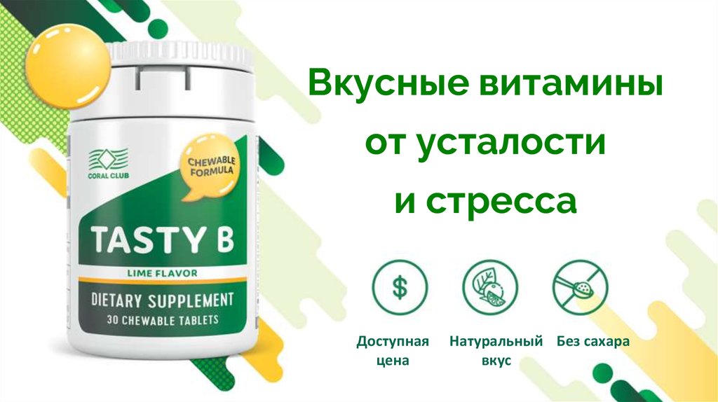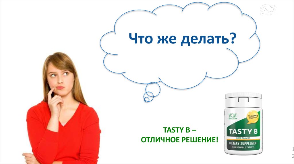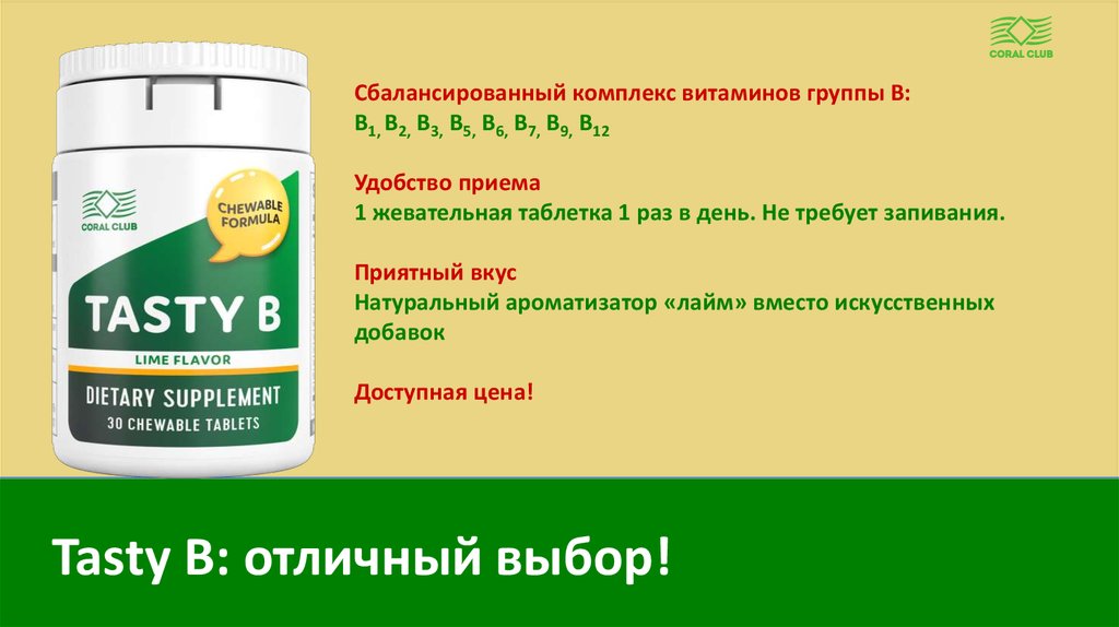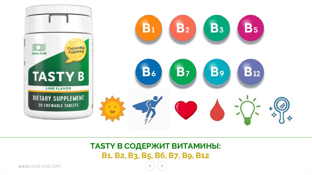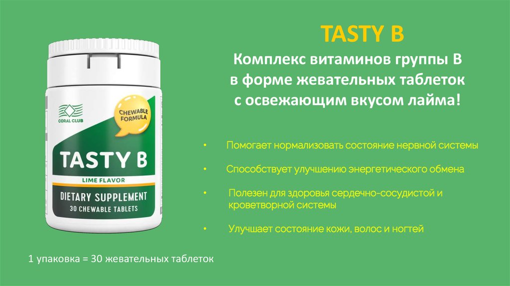 TASTY B СОДЕРЖИТ ВИТАМИНЫ:В1, В2, В3, В5, В6, В7, В9, В12