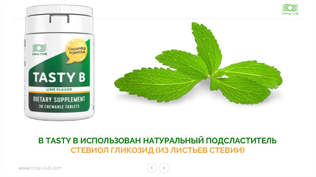 В TASTY B ИСПОЛЬЗОВАН НАТУРАЛЬНЫЙ ПОДСЛАСТИТЕЛЬСТЕВИОЛ ГЛИКОЗИД (ИЗ ЛИСТЬЕВ СТЕВИИ)