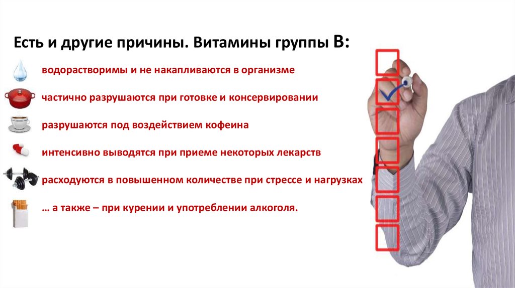 Есть и другие причины. Витамины группы В:водорастворимы и не накапливаются в организме