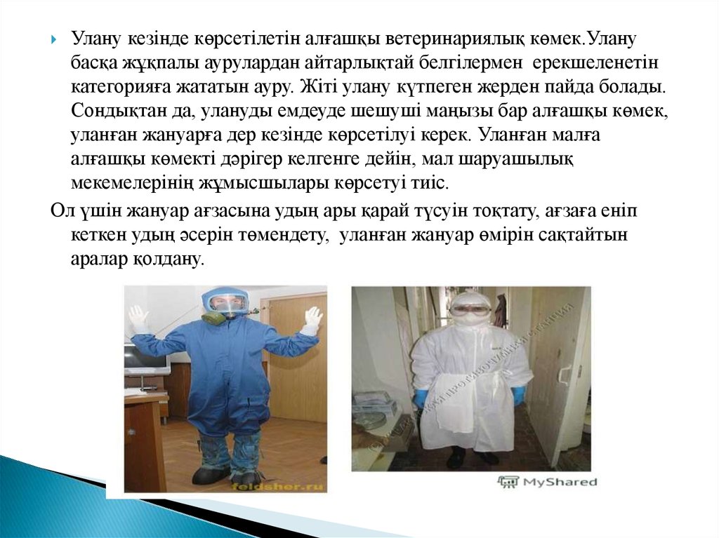 Улану кезінде көрсетілетін алғашқы ветеринариялық көмек.Уланубасқа жұқпалы аурулардан айтарлықтай белгілермен ерекшеленетін