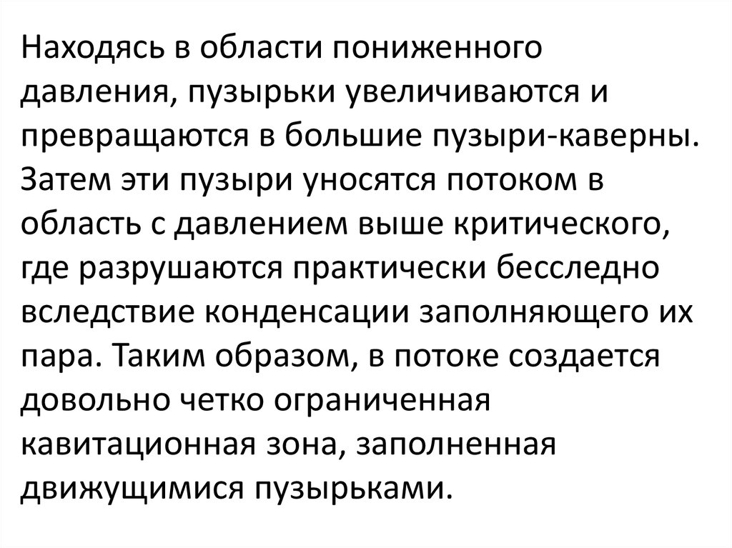 Образующиеся при возникновении кавитациипузырьки потоком жидкости уносятся в зону