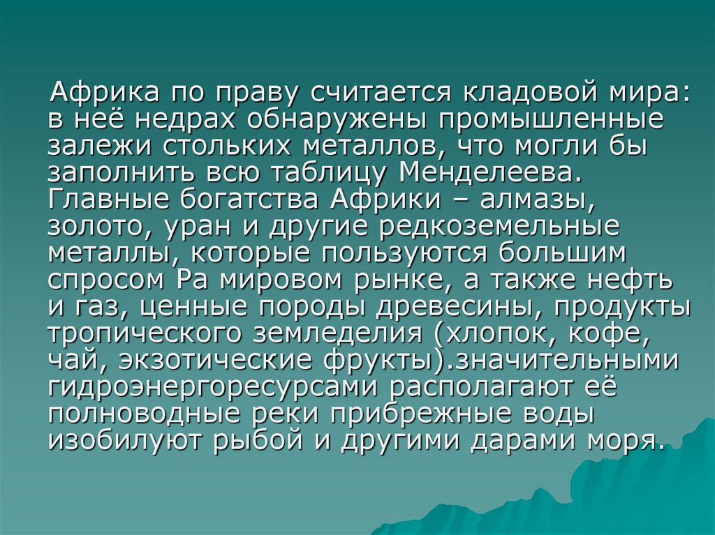 Африка по праву считается кладовой мира:в неё недрах обнаружены промышленные