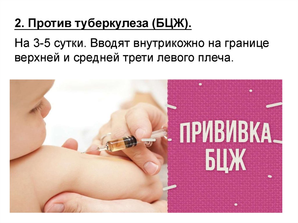 2. Против туберкулеза (БЦЖ).На 3-5 сутки. Вводят внутрикожно на границе