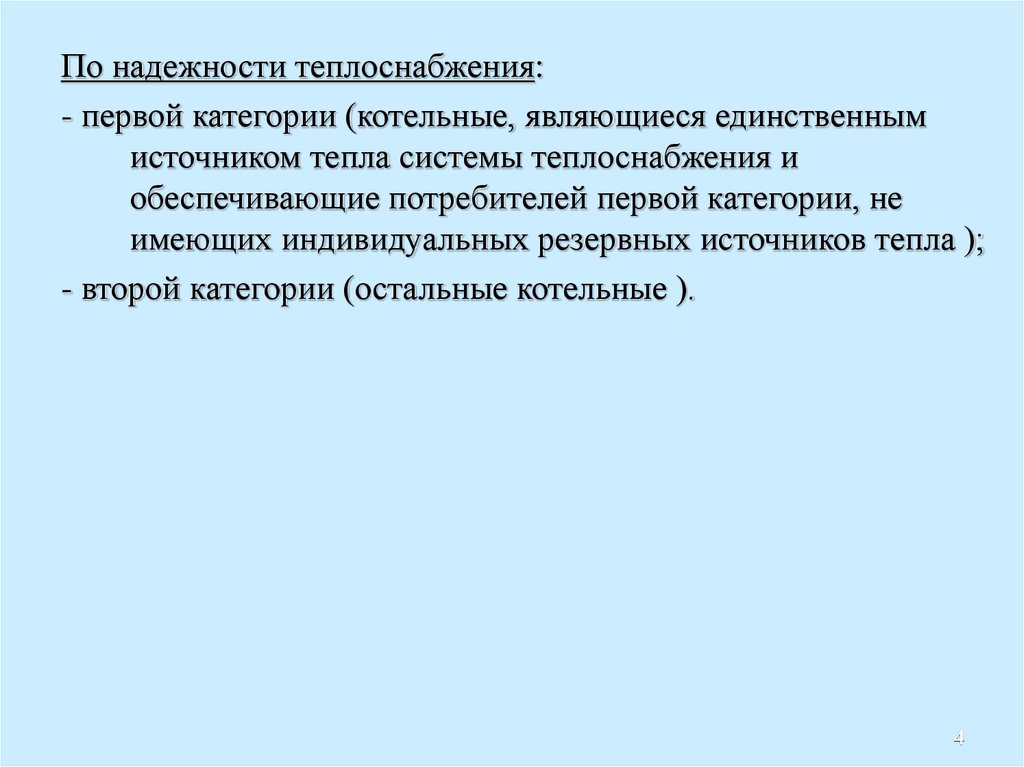 По надежности теплоснабжения:- первой категории (котельные, являющиеся единственным