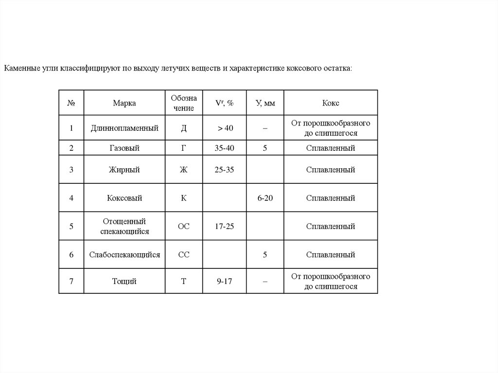 Каменные угли классифицируют по выходу летучих веществ и характеристике коксового остатка:№