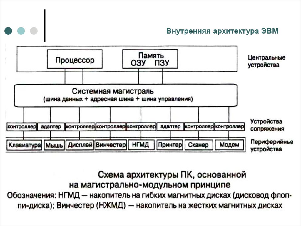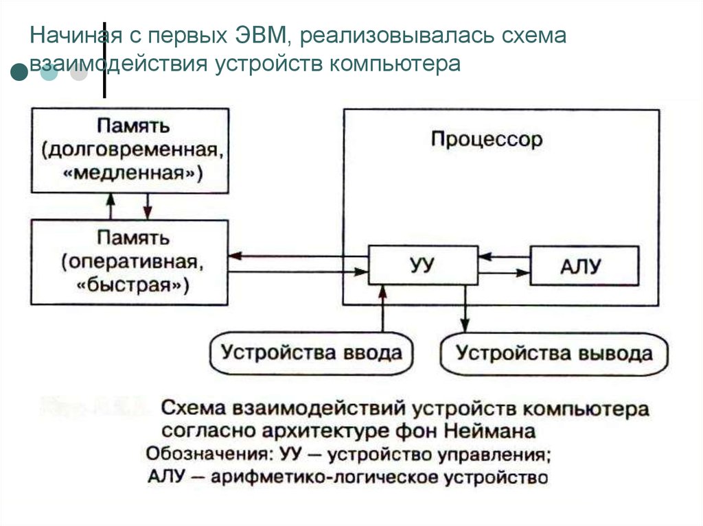 Начиная с первых ЭВМ, реализовывалась схемавзаимодействия устройств компьютера