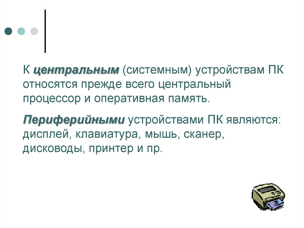 К центральным (системным) устройствам ПКотносятся прежде всего центральный