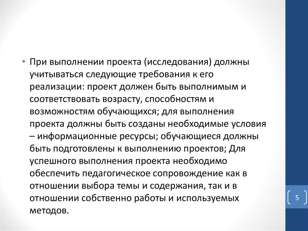 • При выполнении проекта (исследования) должныучитываться следующие требования к его