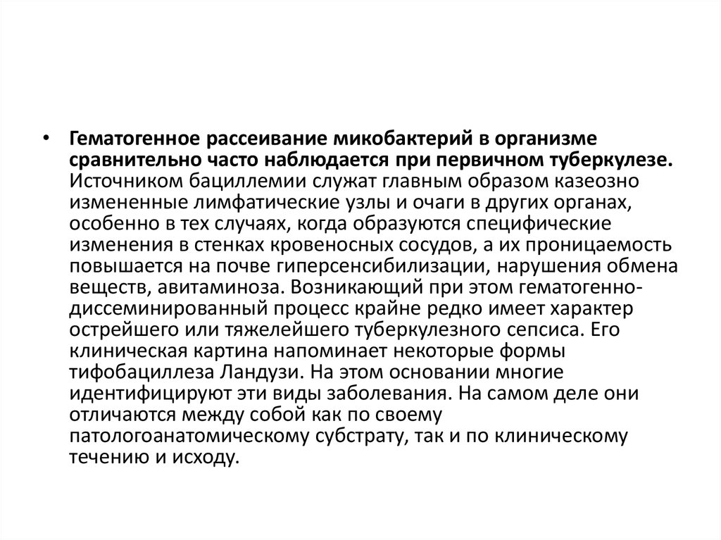 • Гематогенное рассеивание микобактерий в организмесравнительно часто наблюдается при первичном туберкулезе.