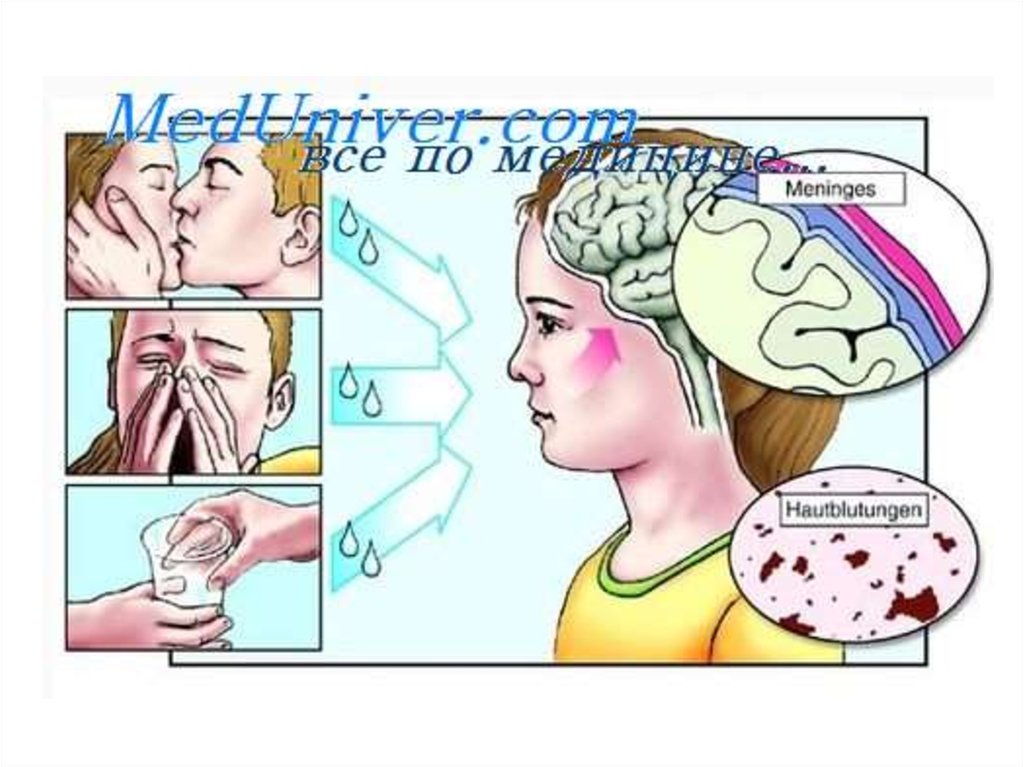 исход, в легких, печени, селезенке, а при менингите и в мягких