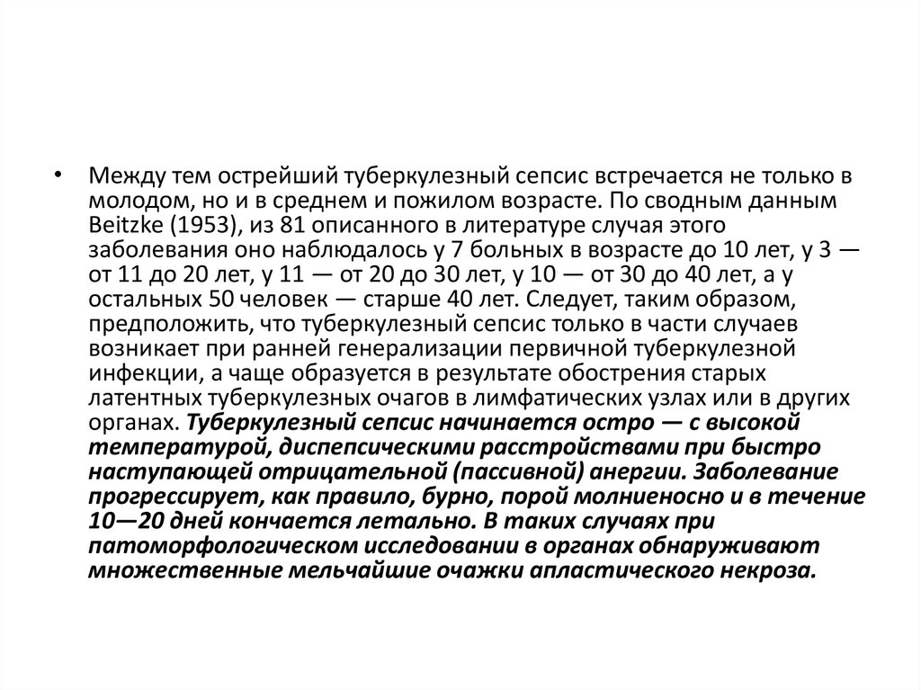 • Между тем острейший туберкулезный сепсис встречается не только вмолодом, но и в среднем и пожилом возрасте. По сводным данным