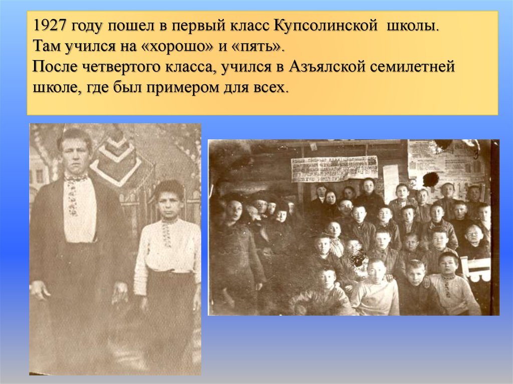 1927 году пошел в первый класс Купсолинской школы.Там учился на «хорошо» и «пять».