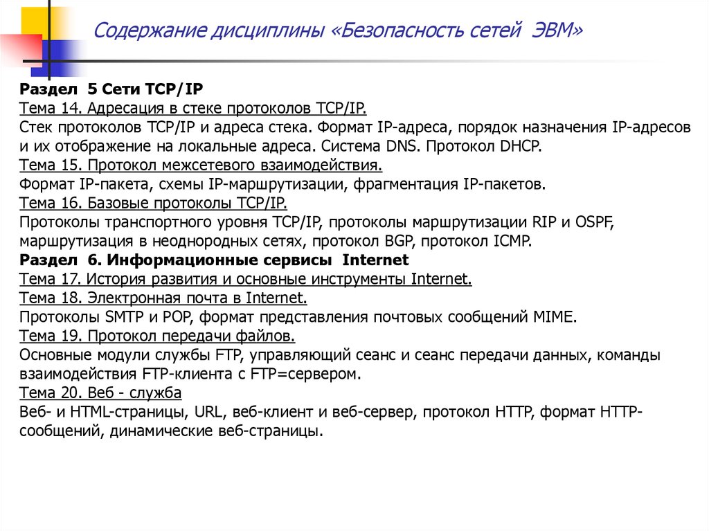 Содержание дисциплины «Безопасность сетей ЭВМ»Раздел 5 Сети TCP/IP