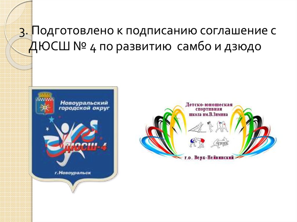 3. Подготовлено к подписанию соглашение сДЮСШ № 4 по развитию самбо и дзюдо