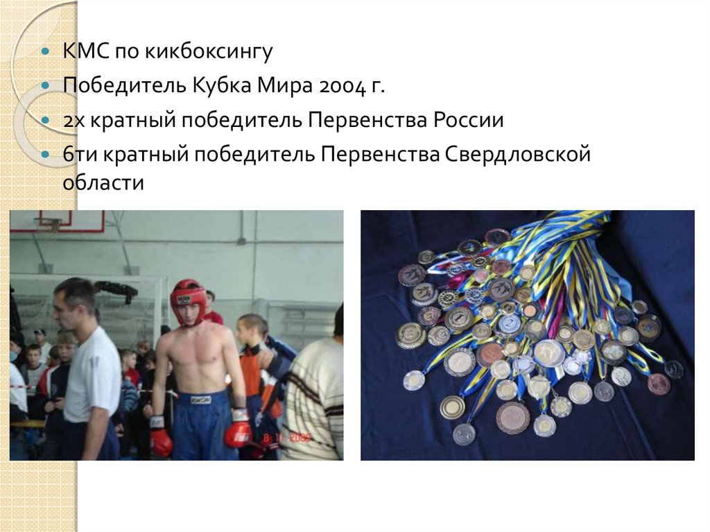 КМС по кикбоксингуПобедитель Кубка Мира 2004 г.