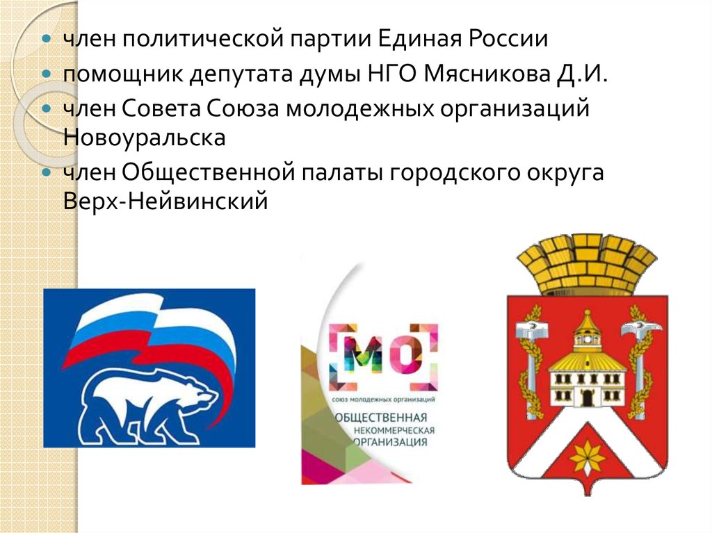 член политической партии Единая Россиипомощник депутата думы НГО Мясникова Д.И.