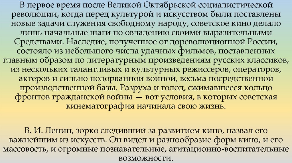В. И. Ленин, зорко следивший за развитием кино, назвал его