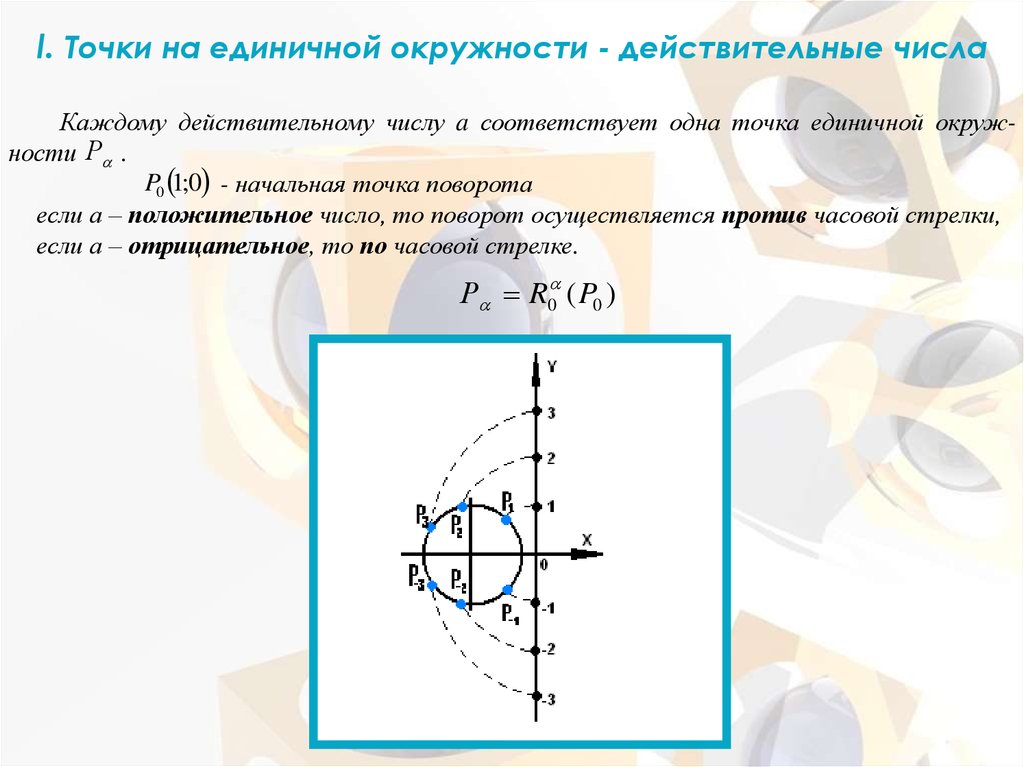 I. Точки на единичной окружности - действительные числаКаждому действительному числу a соответствует одна точка единичной окружности Р .
