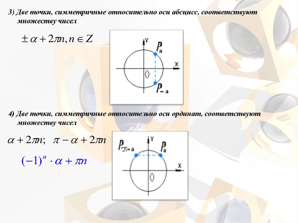 3) Две точки, симметричные относительно оси абсцисс, соответствуютмножеству чисел