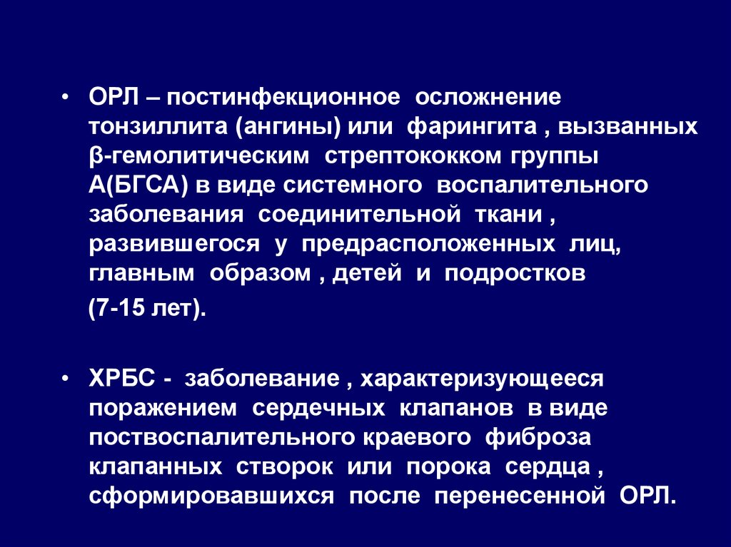 • ОРЛ – постинфекционное осложнениетонзиллита (ангины) или фарингита , вызванных