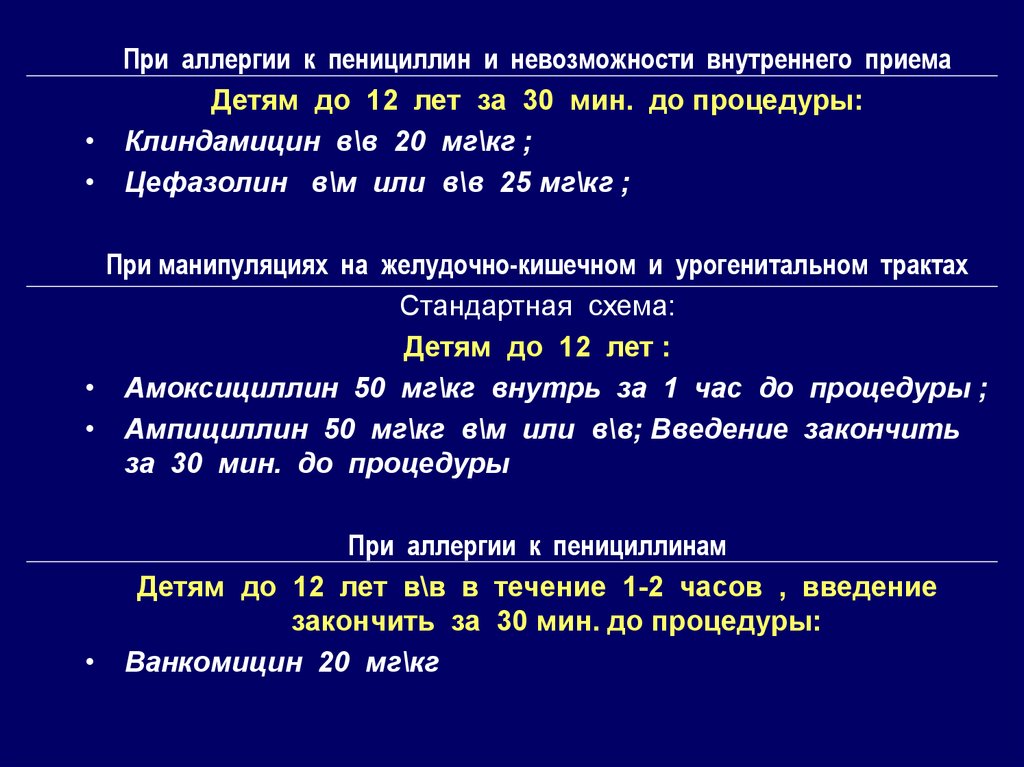 При аллергии к пенициллин и невозможности внутреннего приемаДетям до 12 лет за 30 мин. до процедуры: