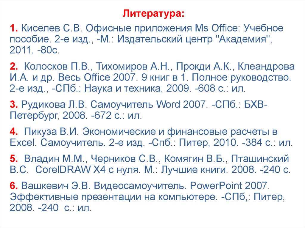 Литература:1. Киселев С.В. Офисные приложения Ms Office: Учебное