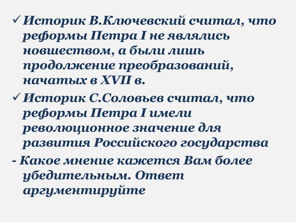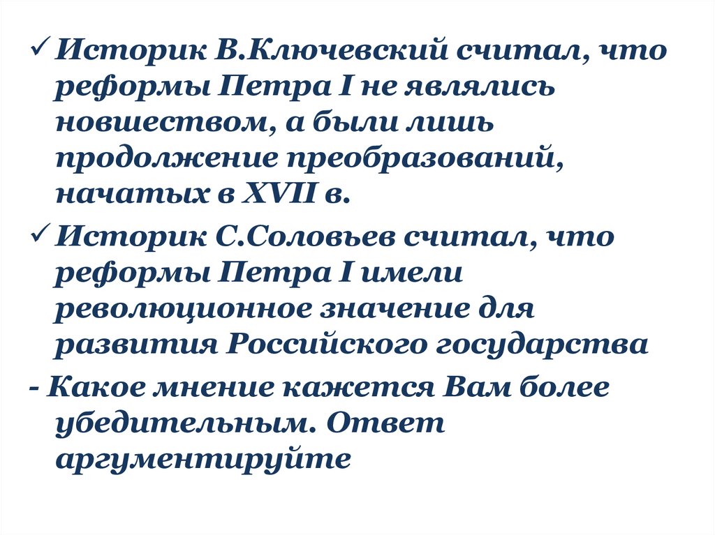 Историк В.Ключевский считал, чтореформы Петра I не являлись
