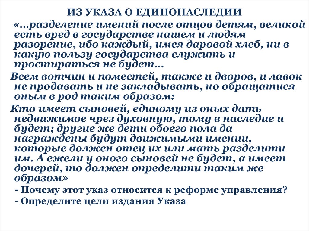 ИЗ УКАЗА О ЕДИНОНАСЛЕДИИ«…разделение имений после отцов детям, великой