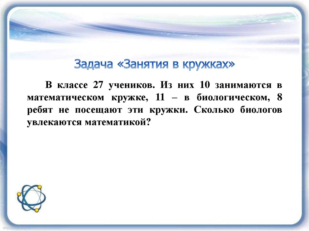 В классе 27 учеников. Из них 10 занимаются вматематическом кружке, 11 – в биологическом, 8