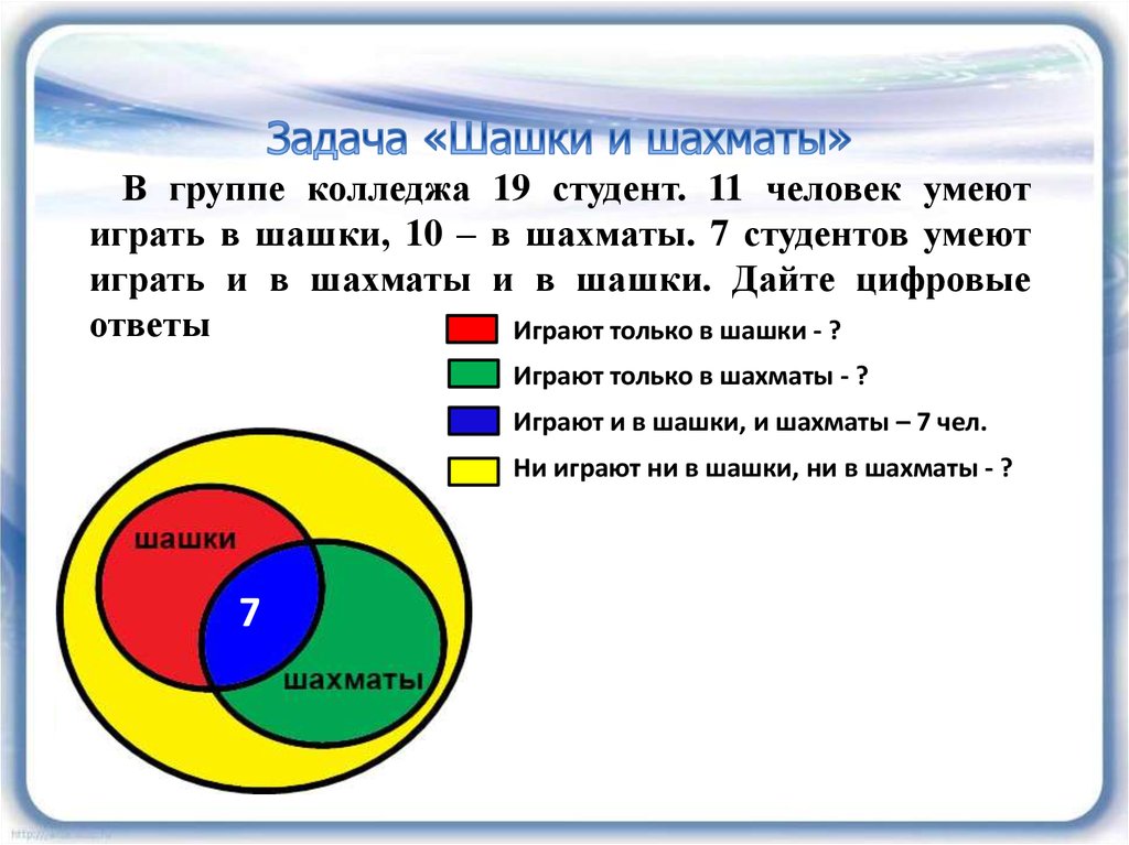В группе колледжа 19 студент. 11 человек умеютиграть в шашки, 10 – в шахматы. 7 студентов умеют