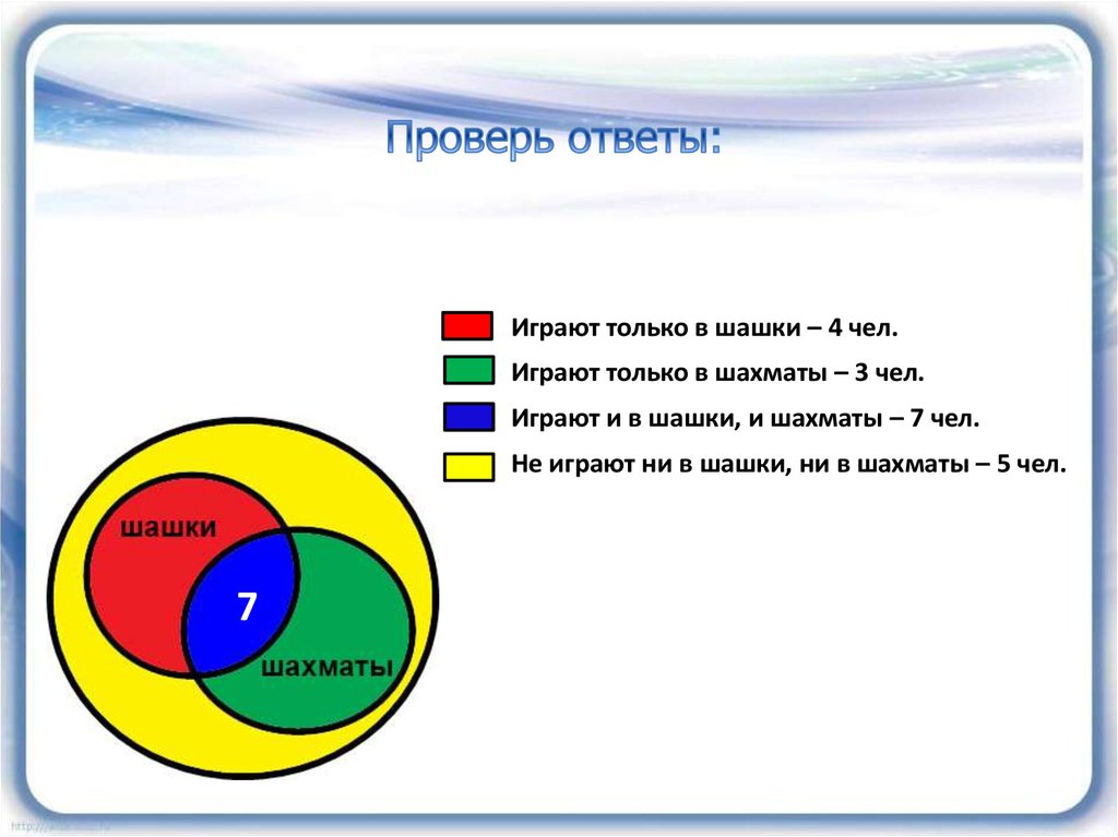 Играют только в шашки – 4 чел.Играют только в шахматы – 3 чел.