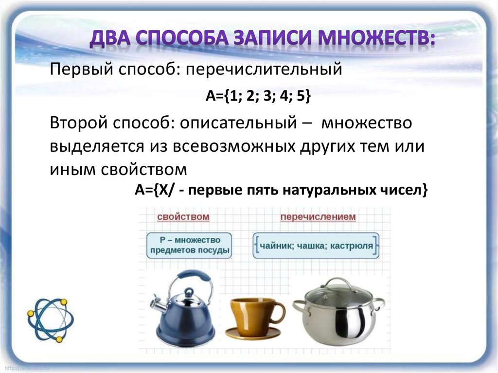 Первый способ: перечислительныйA={1; 2; 3; 4; 5}