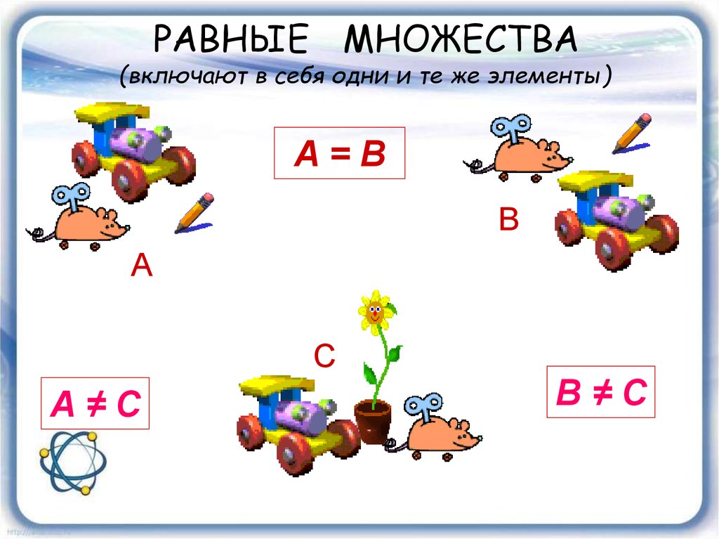 РАВНЫЕ МНОЖЕСТВА(включают в себя одни и те же элементы)