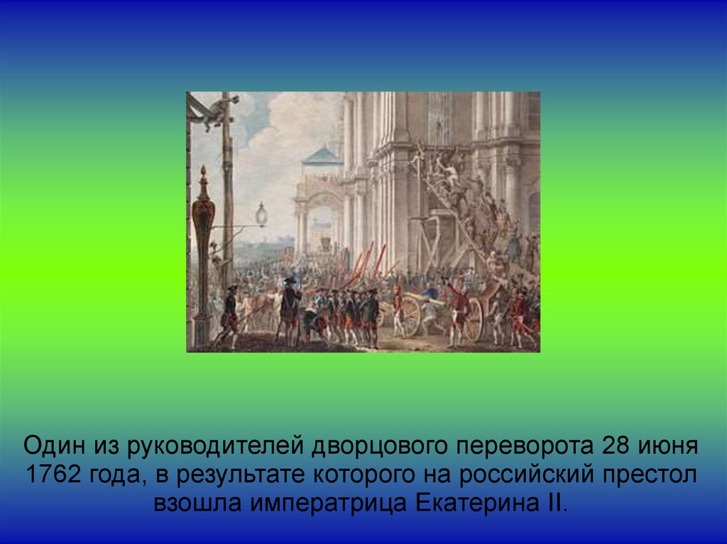 Один из руководителей дворцового переворота 28 июня1762 года, в результате которого на российский престол