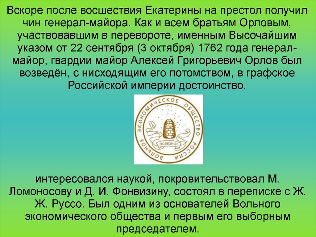 Вскоре после восшествия Екатерины на престол получилчин генерал-майора. Как и всем братьям Орловым,