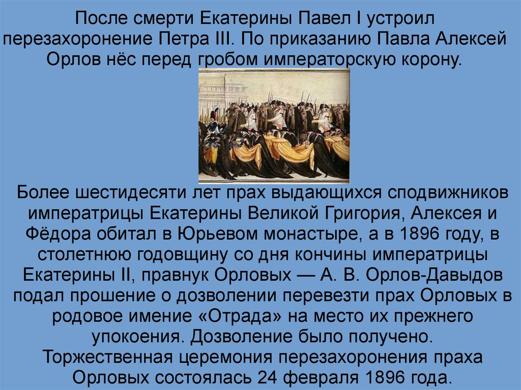 После смерти Екатерины Павел I устроилперезахоронение Петра III. По приказанию Павла Алексей