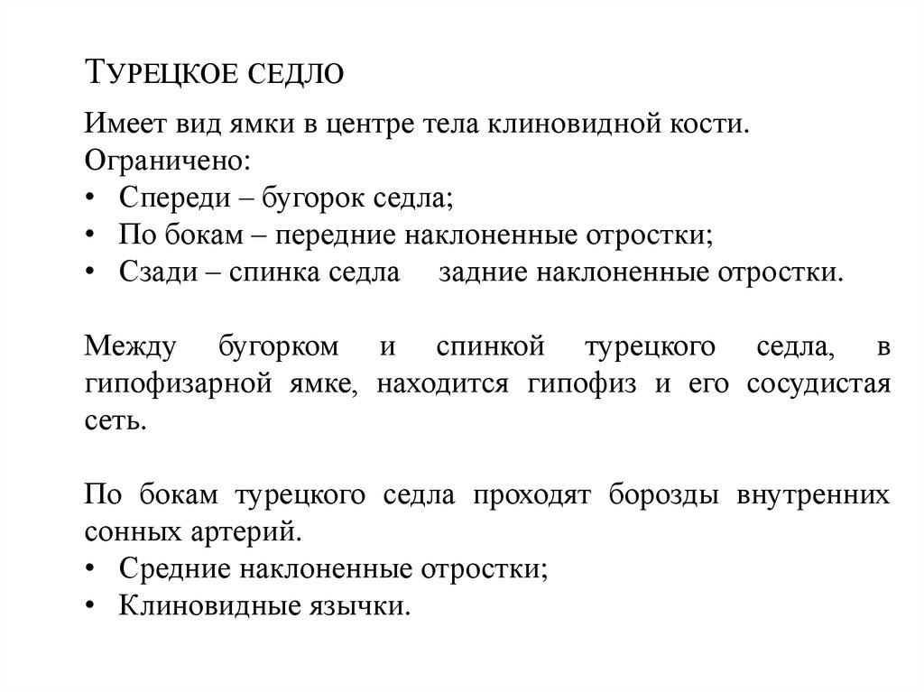 ТУРЕЦКОЕ СЕДЛОИмеет вид ямки в центре тела клиновидной кости.