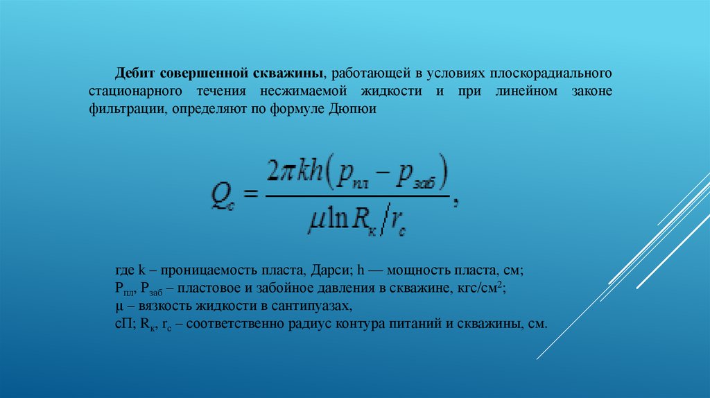 Дебит совершенной скважины, работающей в условиях плоскорадиальногостационарного течения несжимаемой жидкости и при линейном законе