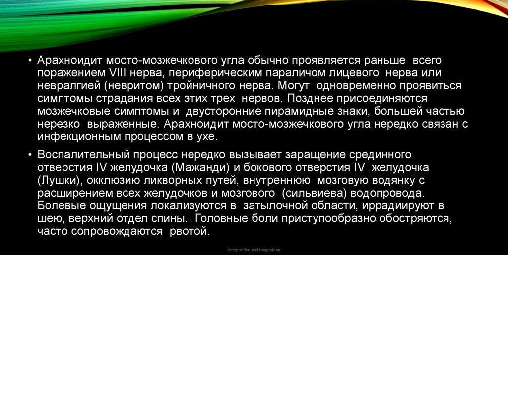lOMoARcPSD• Арахноидит мосто-мозжечкового угла обычно проявляется раньше всего