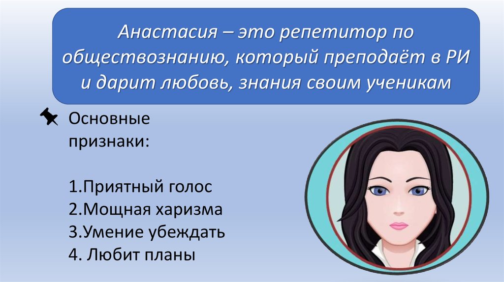 Анастасия – это репетитор пообществознанию, который преподаёт в РИ