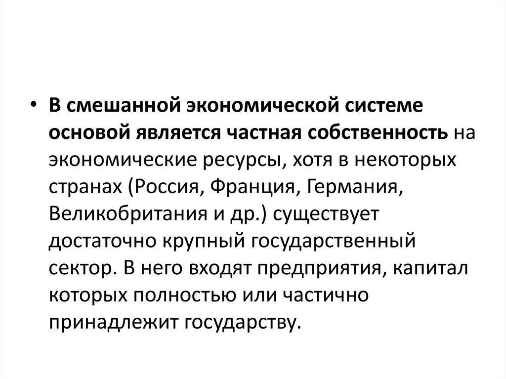 • В смешанной экономической системеосновой является частная собственность на